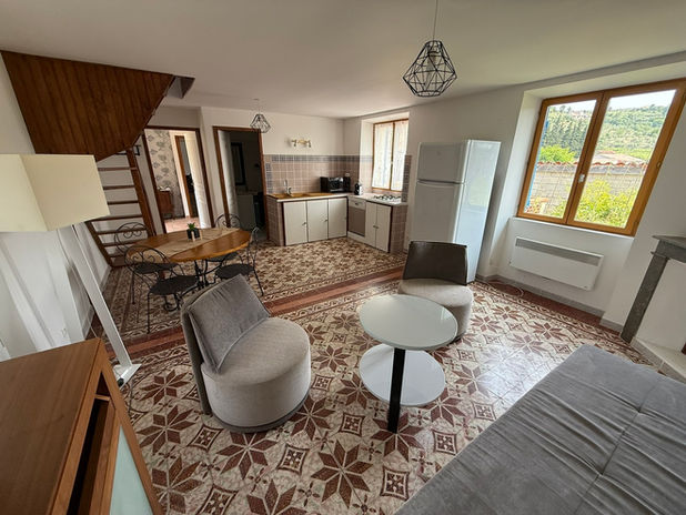 Aménagé dans un ancien mas en pierre qui servait autrefois de logement aux ouvriers de la filature, il a été rénové avec soin pour préserver son caractère d'origine : murs en pierre apparente, planchers en bois, poutres d’époque.
